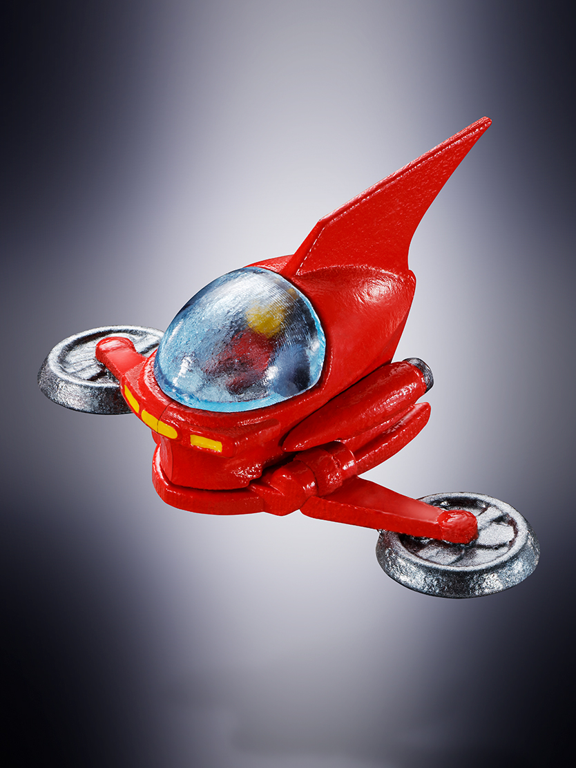 マジンガーZの操縦コクピットになる「ホバーパイルダー」は主翼の折り畳みが可能。クリアパーツのキャノピー内には兜甲児の姿も再現。マジンガーZの頭部へと内蔵マグネットで合体する。
