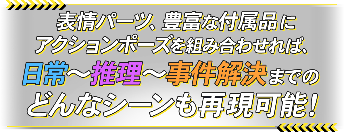 【セット内容】 本体、交換用表情パーツ3種、交換用手首パーツ 左右各5種(探偵バッチ持ち手含む)、交換用眼鏡2種、ターボエンジン付きスケボー