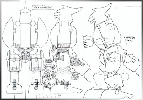 • 超合金魂の守護獣ティラノザウルスの原案。DX大獣神では動かせなかったヒジ(前方向)、上腕や足の付根のロー ル、サイドアーマーなど可動部に関する指示が書かれている。