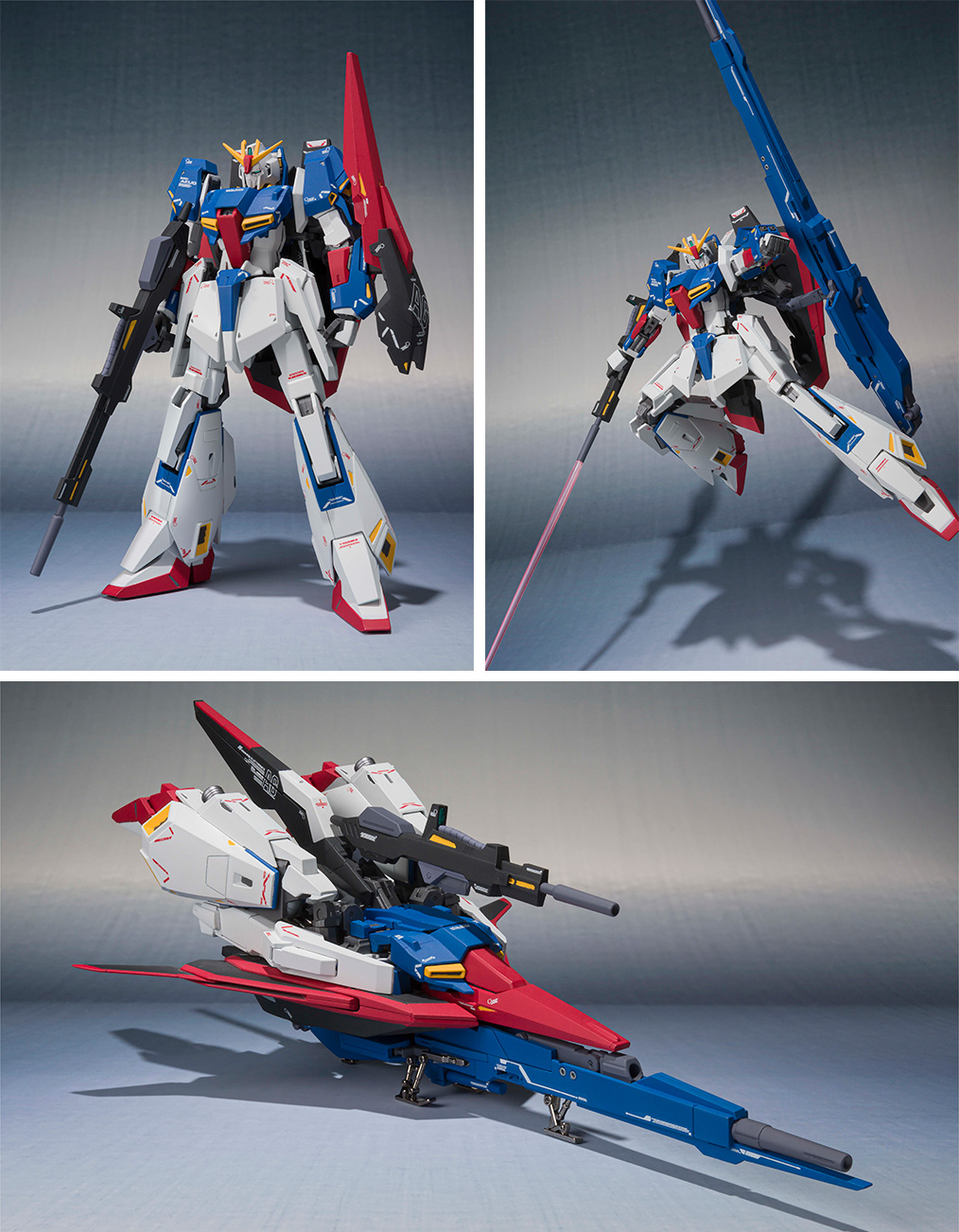 カトキハジメ氏完全監修のもと、徹底的にこだわった造形で、ダイキャストを用いた可動フレームにより安定した変形機構を実現!! 変形機構を備えつつ、モビルスーツとウェイブライダーそれぞれのプロポーションを余すことなく再現!! モビルスーツとしてのポージングも可変機体であることを思わせない自然なフォルムで再現でき、ハイパー・メガ・ランチャーも付属してダイキャストのランディング・ギアで安定した駐機状態も再現できます。本体や武器の各所にはカトキハジメ氏考案のマーキングが施されており、専用アームによりハイパー・メガ・ランチャーをZガンダム本体に接続可能となっています。