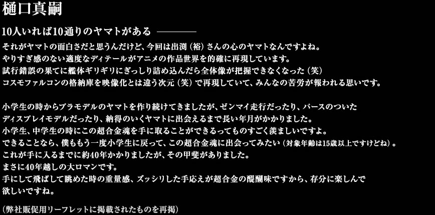 樋口真嗣 10人いれば10通りのヤマトがある──それがヤマトの面白さだと思うんだけど、今回は出渕(裕)さんの心のヤマトなんですよね。やりすぎ感のない適度なディテールがアニメの作品世界を的確に再現しています。試行錯誤の果てに艦体ギリギリにぎっしり詰め込んだら全体像が把握できなくなった(笑)コスモファルコンの格納庫を映像化とは違う次元(笑)で再現していて、みんなの苦労が報われる思いです。小学生の時からプラモデルのヤマトを作り続けてきましたが、ゼンマイ走行だったり、パースのついたディスプレイモデルだったり、納得のいくヤマトに出会えるまで長い年月がかかりました。小学生、中学生の時にこの超合金魂を手に取ることができるってものすごく羨ましいですよ。できることなら、僕ももう一度小学生に戻って、この超合金魂に出会ってみたい(対象年齢は15歳以上ですけどね)。これが手に入るまでに約40年かかりましたが、その甲斐がありました。まさに40年越しの大ロマンです。手にして飛ばして眺めた時の重量感、ズッシリした手応えが超合金の醍醐味ですから、存分に楽しんで欲しいですね。(弊社販促用リーフレットに掲載されたものを再掲)
