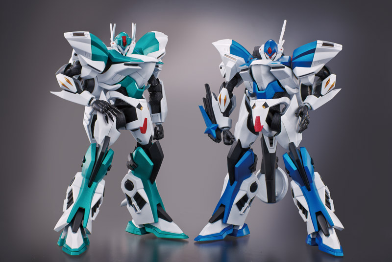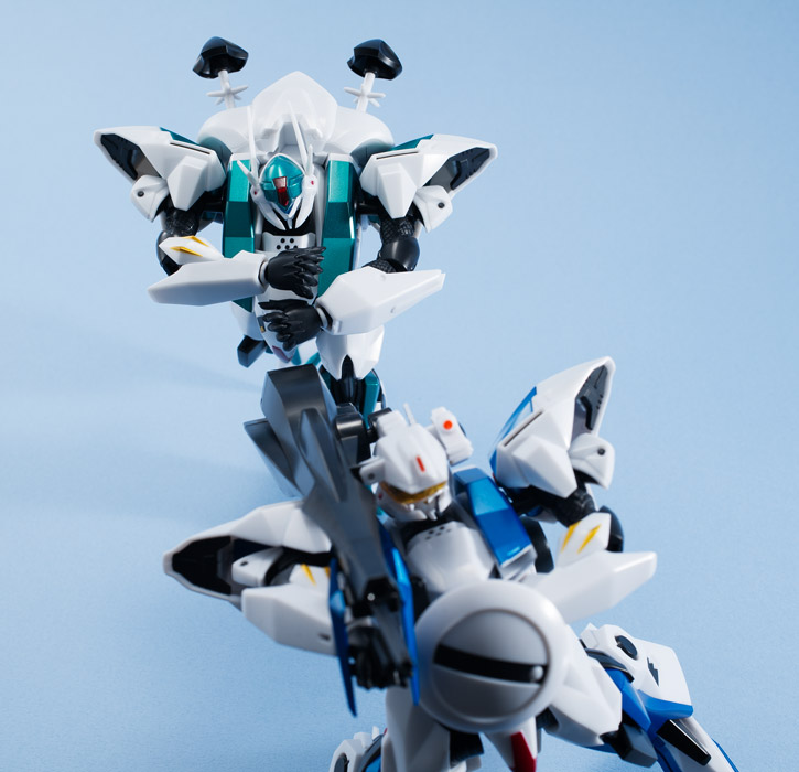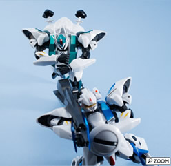 [左 : 1号機] 初期型の「1号機」に組み替えて、フェルミオン砲の照準器であるレーザーガンを構える姿。 背部フェルミオン砲や腕部外装は、発売済みの「2号機」のパーツを取り外して流用。レーザーガンや頭部は、配色が異なることもあり、「1号機改」に換装用パーツが同梱される。